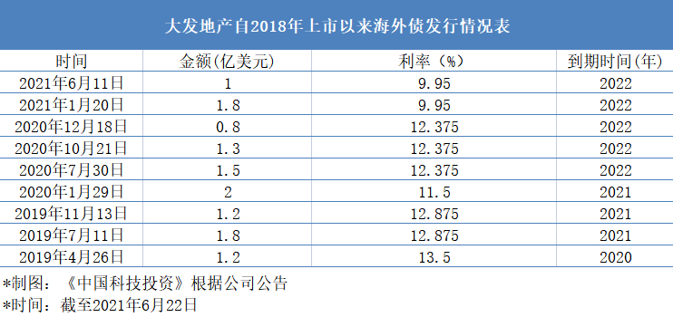 除此之外,大发地产还在高息发债融资“输血”。根据巨潮资讯网的消息,今年1月,大发地产发行了1.8亿美元、票面利率9.95%的优先票据;6月11日,大发地产又额外发行了1亿美元。