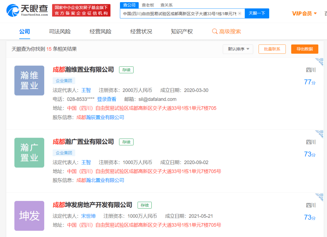 而记者在天眼查以该地址作为关键词进行搜索,结果出现了15家公司,包括成都瀚旸置业有限公司、成都垠康企业管理咨询有限公司、成都瀚广置业有限公司、成都瀚维置业有限公司、成都瀚智置业有限公司和成都坤发等。